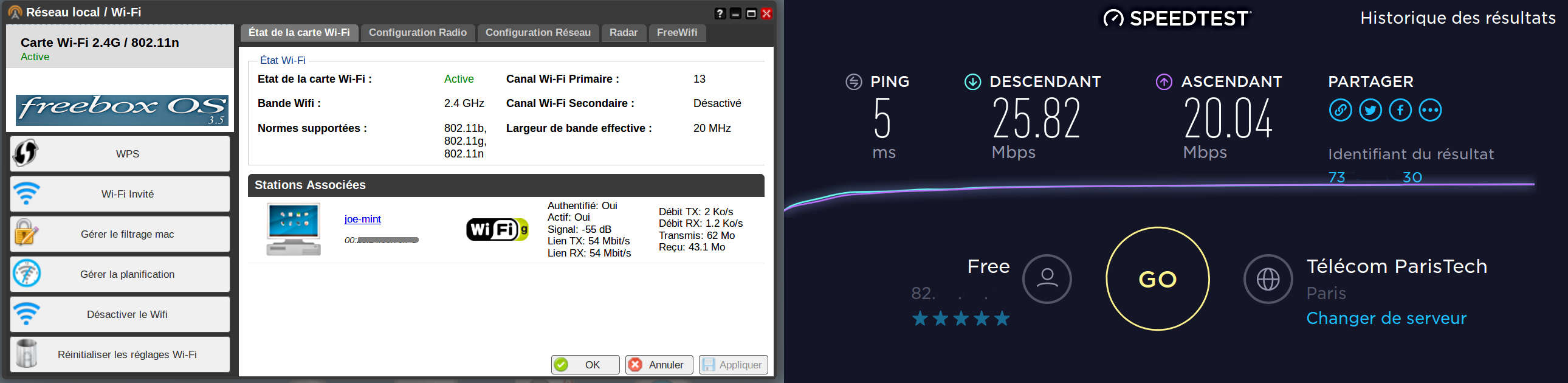Nota bene : Il faut signaler qu’avec le même PC et sa carte Wi-Fi Intel sous Windows connectée à la même Freebox, le 802.11 N fonctionne correctement avec des débits réels d’~ 50 Mb/s (1 flux TX/RX) aussi bien descendants que montants !